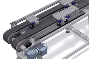 In this particular application the SPU will equalise and buffer each dishwasher housing carrier between two machines through the process of becoming a welded unit and a fully assembled unit. There is also a requirement to stop the carriers for optical inspections via image processing and for mounting further components.