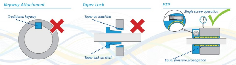 When it comes to quick, accurate and reliable shaft to hub connection the ETP range of products are a market leader. Whether the hubs are to be removed or repositioned, mounted and dismantled within an application, the ETP product allows this to be all done in less than a few minutes and without marking the shafts. The unique product eliminates the need for keyways, whilst the hydraulic principle gives immediate advantages for today´s modern power transmission designs.